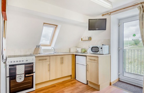 Amenities: Electric central heating. Electric oven and hob, microwave, fridge/freezer, washing machine, TV with Freeview, DVD, WiFi. Fuel and power inc. in rent. Bed linen inc. in rent. Off road parking for 1 car. Decked patio area with furniture and BBQ. Bike storage. One well-behaved pet welcome. Sorry, no smoking. Shop 1.5 miles, pub 1 min walk. Note: Property is accessed via a flight of external steps. Note: Located close to main road.